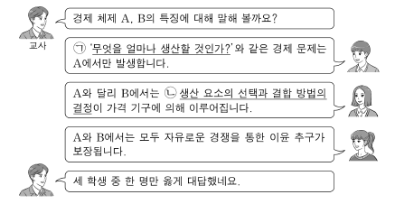6. 그림은 경제 수업의 일부이다. 이에 대한 설명으로 옳은 것은? (단, A, B는 각각 계획 경제 체제, 시장 경제 체제 중 하나임.)