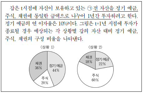 ⑤ 전 자산을 주식과 채권에 절반씩 투자한다면, <상황 1>과 <상황 2> 간 투자 수익 차이는 ㉠의 경우에 비해 작아진다.