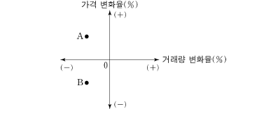 갑국 정부는 시장 균형에서 거래되고 있는 X재 시장에 실효성 있는 가격 규제 정책 (가), (나) 중 하나를 시행하려고 한다. 그림의 A 점은 (가), B 점은 (나) 시행에 따른 시장 가격과 시장 거래량의 변화율을 나타낸다. 단, X재는 수요와 공급 법칙을 따르고 (가), (나) 시행 전후 수요와 공급의 변동은 없으며, 암시장은 발생하지 않는다.