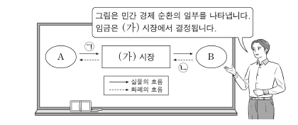 1. 그림은 교사의 수업 장면이다. 이에 대한 설명으로 옳은 것은? (단, A, B는 각각 가계, 기업 중 하나임.)