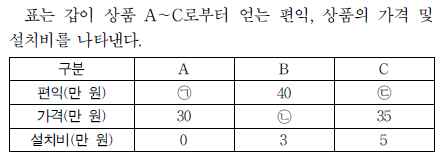 갑은 상품 A~C 중 A를 구입하였고, 그 직후 B의 가격에 대한 20% 할인과 C의 설치비 면제 행사가 시작되었다. B 또는 C를 새로 구입할 경우, A에 대한 환불은 불가하지만 A를 중고 거래 시장에서 거래 비용 없이 최대 25만 원에 판매 가능하다. 이에 갑은 다음 세 가지 방안 중 하나를 선택하려고 한다. 단, 갑은 편익과 기회비용만을 고려하여 합리적으로 선택하고, 상품 A~C로부터 얻는 편익은 변함이 없다.