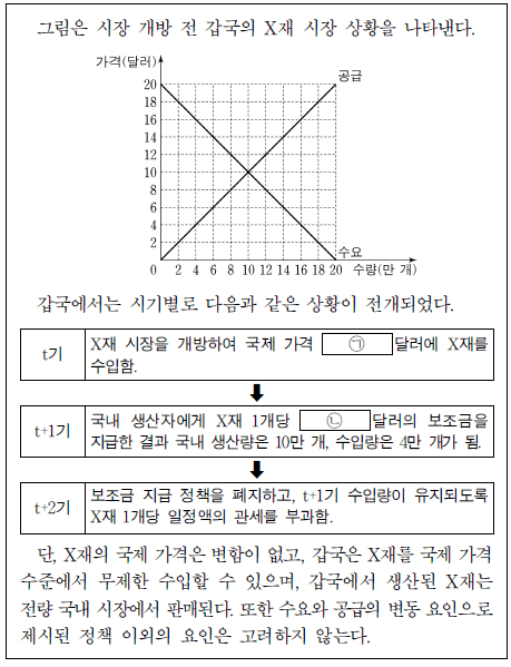 ㄴ. 소비자에게 X재 1개당 20달러의 보조금을 지급하면 거래량은 10개 증가한다.
