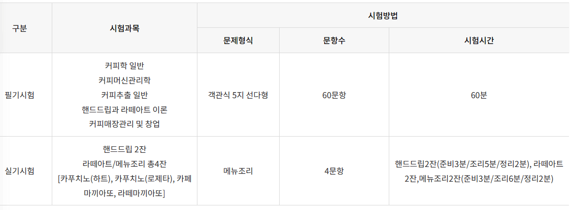 실기 : 100점 만점에(핸드드립40점, 라테아트/메뉴조리 60점) 60점 이상