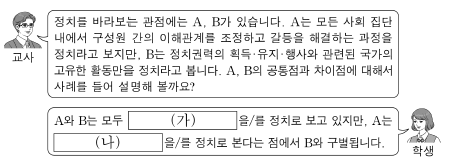 A, B, C는 모두 (가) 는 점에서 정치 과정에 영향력을 행사하는 주체로 볼 수 있지만, A는 (나) 는 점에서 B, C와 구별되는 특징을 갖는다. 소속 집단의 특수한 이해관계를 관철하기 위해 정치 활동을 하는 B와 공익 추구를 목적으로 공공의 이해관계가 걸린 쟁점을 제기하고 해결을 요구하는 C는 모두 정책 결정 과정에서 해당 집단의 요구가 관철되기를 원하지만, B와 C는 모두 정치권력을 목표로 하는 집단은 아니다. 하지만 A는 단순히 요구의 전달에 그치지 않고 그 구성원이 공유하는 공통의 정치적 가치에 기반하여 정치권력을 획득해야 하는 이유를 제시함으로써 유권자를 설득해야 한다.