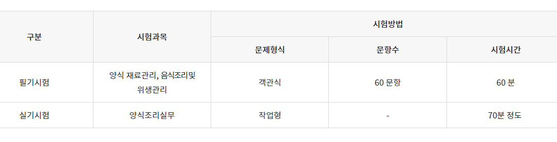 필기는 2020년 기준 양식 재료관리 음식 조리 및 위생관리 과목으로 간소화됐으며 객관식 4지 택일형 60문항 60분간 진행됩니다. 합격기준은 100점 만점 중 60점 이상 취득해야 합니다.