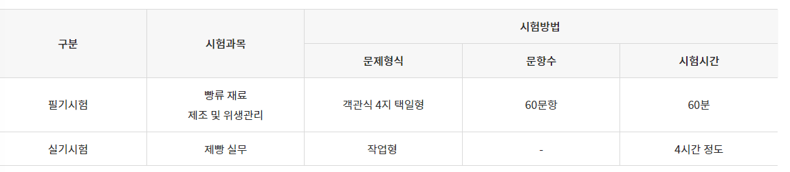 필기시험의 경우 빵류 제조, 빵류 제조 및 위생관리 2과목을 시험 보기 때문에 비교적 다른 자격증에 비해 공부량이 많지 않습니다.