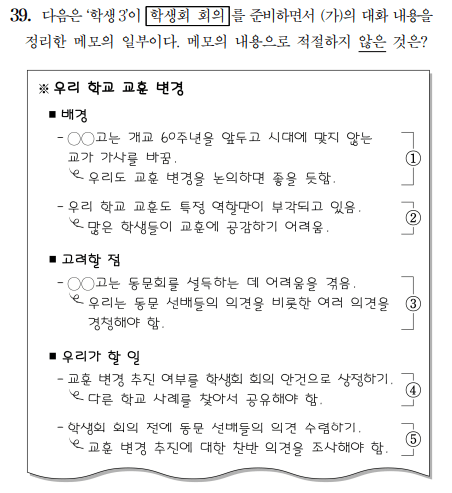 [38~42] (가)는 학생회 학생들의 대화이고, (나)는 학생회 대표가 쓴 건의문이다. 물음에 답하시오.