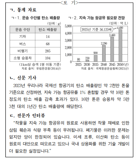 ⑤ ㄱ-2와 ㄷ을 활용하여, 지속 가능 항공유의 예상 수요가 지속적 으로 증가하지만 공급에 제약이 있다는 내용으로, 정부가 기업을 지원하여 생산 기술의 고도화를 통해 지속 가능 항공유의 공급 역량을 강화하려는 이유를 5문단에 보강한다.