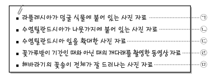 ⑤ ㉤은 사진 속 식물의 꽃송이가 낱낱의 꽃들이 한데 모여 이루어져 있다는 내용을 설명하는 데에 활용되었다.