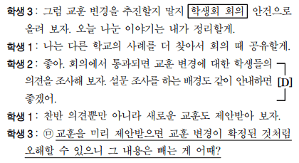 ④ 학생들의 의견 조사를 제안한 [D]의 내용은, ㉱를 고려하여 (나)에서 교훈을 변경해 달라는 건의 내용에 대한 근거를 설문 조사 방법을 통해 마련한 것으로 반영되었다.
