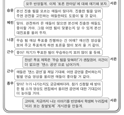 ③ ‘토론 한마당’에는 본선 진출 팀의 요청 사항에 대한 ‘승윤’과 ‘혜린’의 대화를 반영하여 본선에서 겨루는 팀을 확인할 수 있는 대진표를 제시하였다.