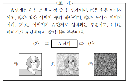 ② (나)에 ㉢이 출력된다면, A 단계의 노이즈 생성기에서 생성된 노이즈가 이미지 연산기에서 확산 이미지에 더해졌겠군.