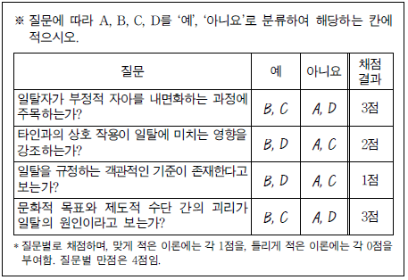 14. 다음은 일탈 이론 A~D를 구분하는 질문에 대한 학생의 분류와 교사의 채점 결과이다. 이에 대한 설명으로 옳은 것은? (단, A~D는 각각 뒤르켐의 아노미 이론, 머튼의 아노미 이론, 차별 교제 이론, 낙인 이론 중 하나임.) [3점]