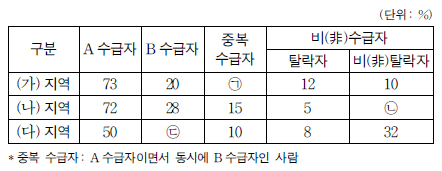갑국에는 사회 보장 제도 A, B만 존재하며, A, B는 우리나라의 사회 보장 제도와 동일하다. A는 사전 예방적 성격이 강한 제도이고, B는 사후 처방적 성격이 강한 제도이다. 표는 갑국의 (가)~(다) 지역별 전체 인구 중 A, B 수급자 비율 및 비(非)수급자 비율을 나타낸 것이다. 비(非)수급자는 A나 B 중 어느 것도 받지 않는 사람으로서, A나 B의 복지 혜택이 필요하지만 수급 자격 조건에 미달하여 받지 못하는 사람(탈락자)과 비(非)수급자에서 탈락자를 제외한 사람(비(非)탈락자)으로 구성된다. 단, (가)~(다) 지역의 중복 수급자 수는 동일하다.