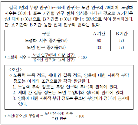 ⑤ 노동력 부족 정도는 t+50년보다 t+30년이, 세대 간 갈등 정도는 t+30년보다 t+50년이 크다.
