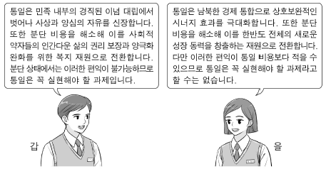 ⑤ 갑과 을 : 분단 비용 해소와 통일 편익을 통일의 근거로 고려해야 한다.