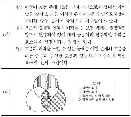 9. (가)의 갑, 을, 병 사상가들의 입장을 (나) 그림으로 표현할 때, A~D에 해당하는 적절한 진술만을 <보기>에서 있는 대로 고른것은? [3점]