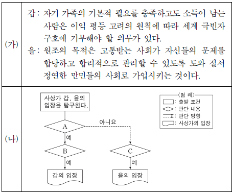 14. (가)의 갑, 을 사상가들의 입장을 (나) 그림으로 탐구하고자 할 때, A~C에 들어갈 적절한 질문만을 <보기>에서 고른 것은? [3점]