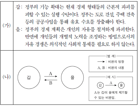 2. (가)의 사회사상가 갑, 을의 입장에서 서로에게 제기할 수 있는 비판을 (나) 그림으로 표현할 때, A, B에 해당하는 내용으로 가장 적절한 것은? [3점]
