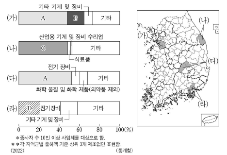 9. 그래프는 지도에 표시된 네 지역군의 제조업 업종별 출하액 비율을 나타낸 것이다. 이에 대한 설명으로 옳은 것은? (단, A~D는 각각 기타 운송 장비, 비금속 광물 제품, 자동차 및 트레일러, 전자 부품․컴퓨터․영상․음향 및 통신 장비 제조업 중 하나임.)