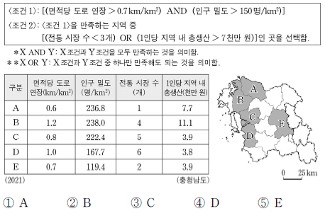 3. 다음 <조건>만을 고려하여 대형 마트를 새로 건설하고자 할 때, 가장 적합한 후보지를 고른 것은?