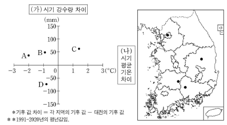 13. 그래프는 지도에 표시된 네 지역과 대전 간의 기후 값 차이를 나타낸 것이다. 이에 대한 설명으로 옳은 것은? (단, (가), (나) 시기는 각각 1월과 8월 중 하나임.)