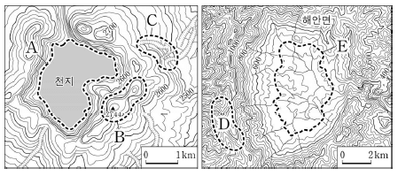 ② A와 E는 화구의 함몰로 형성된 칼데라이다.