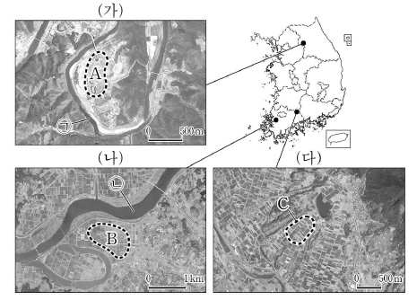 7. 다음은 지도에 표시된 세 지역의 하천 지형을 나타낸 위성 영상 이다. 이에 대한 설명으로 옳은 것은? (단, A~C는 각각 배후 습지, 선상지, 하안 단구 중 하나임.) [3점]