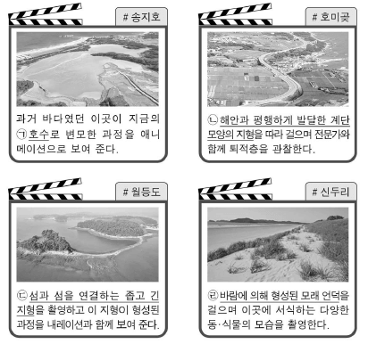 2. 다음 자료는 지형에 관한 다큐멘터리 촬영을 위한 방송 대본이다. ㉠~㉣에 대한 설명으로 옳은 것은?