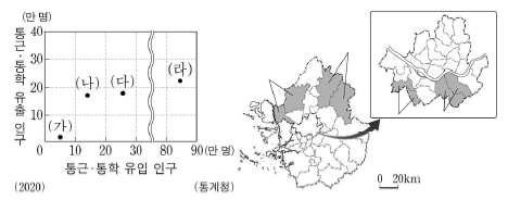 11. 그래프는 지도에 표시된 네 지역군의 통근․통학 유입 및 유출 인구를 나타낸 것이다. (가)~(라) 지역군에 대한 설명으로 옳은 것만을 <보기>에서 고른 것은?