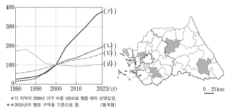 18. 그래프는 지도에 표시된 네 지역의 가구 수 변화를 나타낸 것이다. (가)~(라) 지역에 대한 설명으로 옳은 것은? [3점]